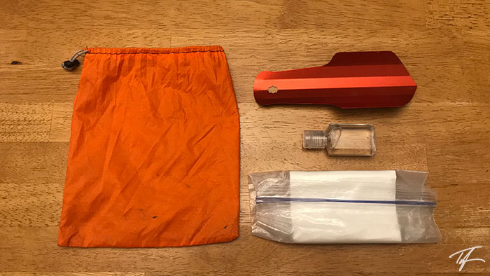 My toilet kit consists of the items listed below. This kit is always easily accessible whether day hiking or backpacking. The consumable weight of toilet paper and sanitizing liquid is not included in the weights listed below.